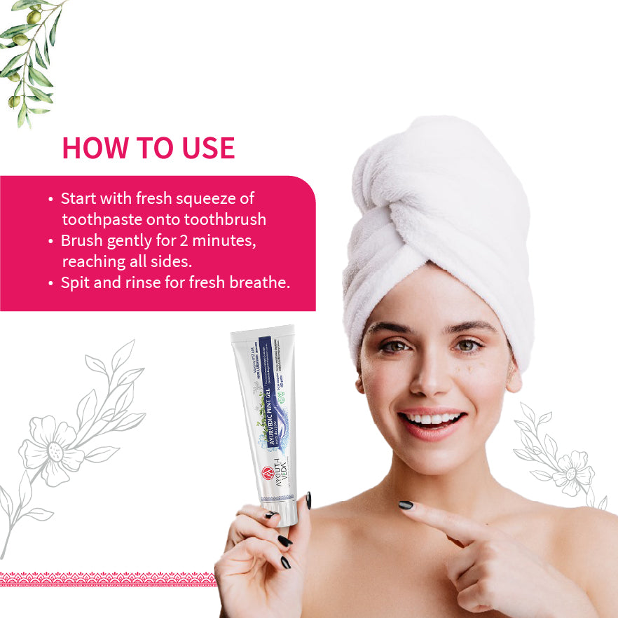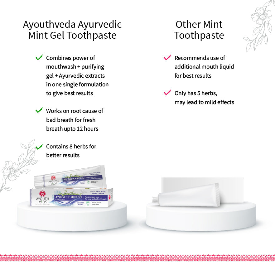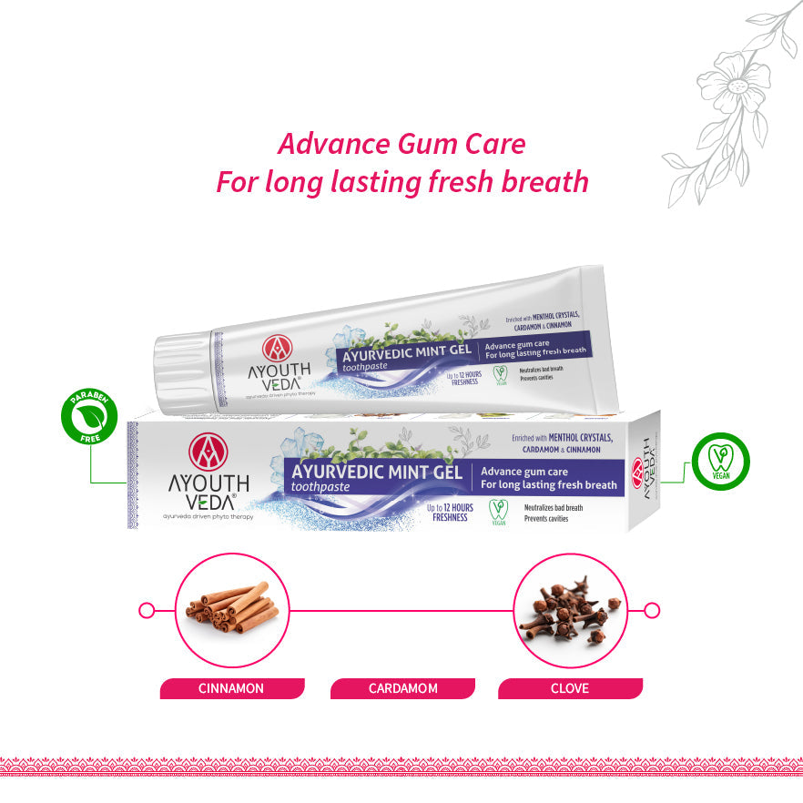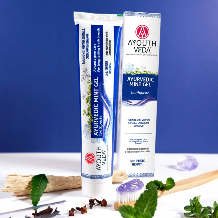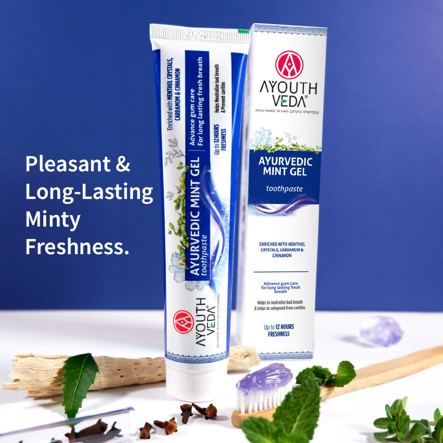 AYOUTHVEDA Mint Gel Toothpaste, infused with a Triple Fresh Formula, combines the benefits of mouthwash, purifying gel, and natural extracts for a refreshing, clean, and protected oral care experience.