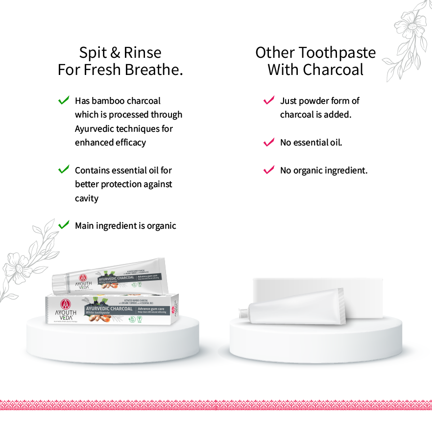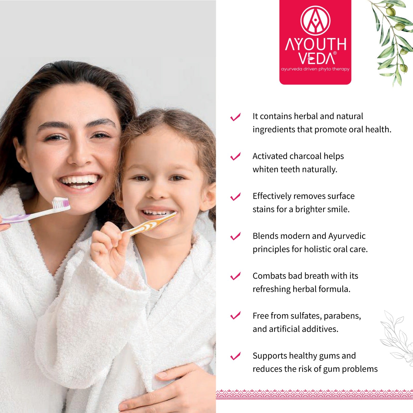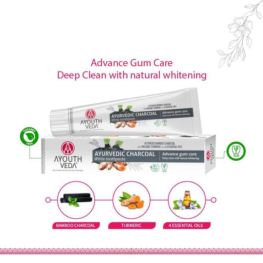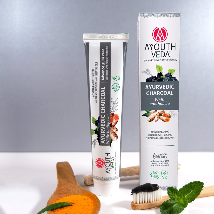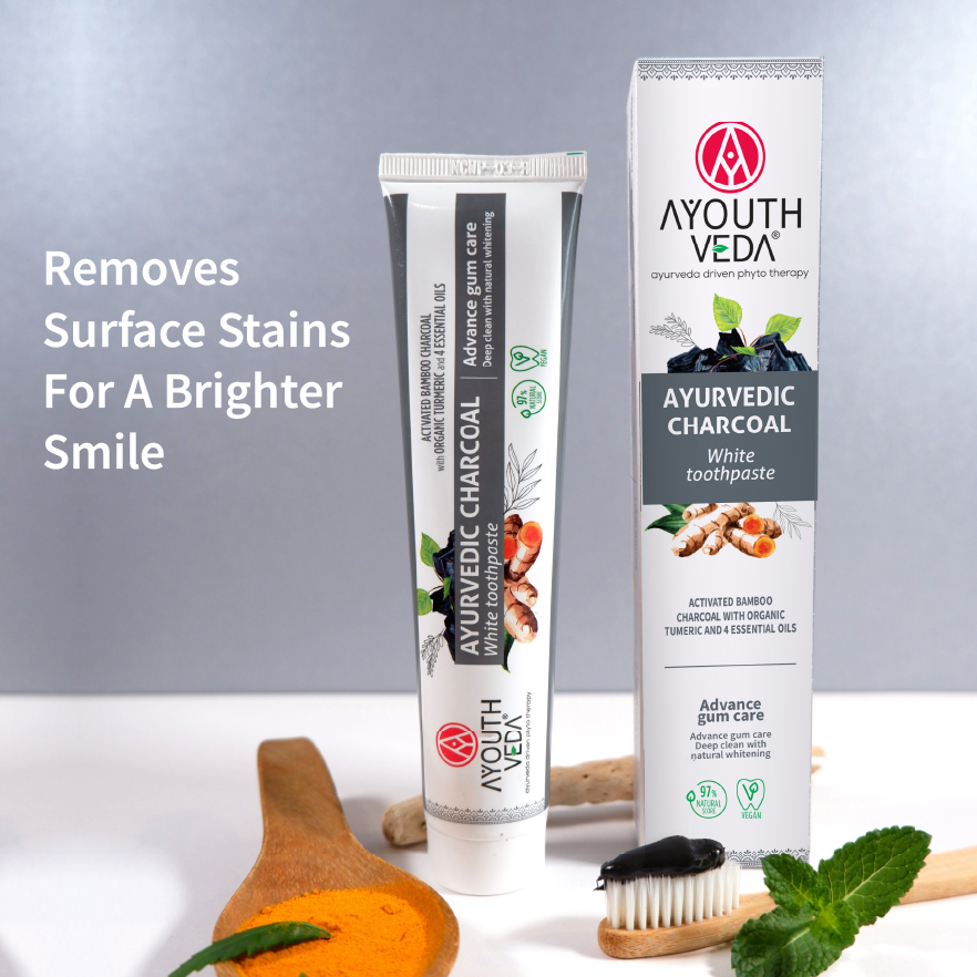 AYOUTHVEDA Ayurvedic Charcoal White Toothpaste is a unique combination of bamboo charcoal & precious extracts of herbs to provide deep cleaning & anti cavity action. It promotes stain removal to ensure complete cleansing.