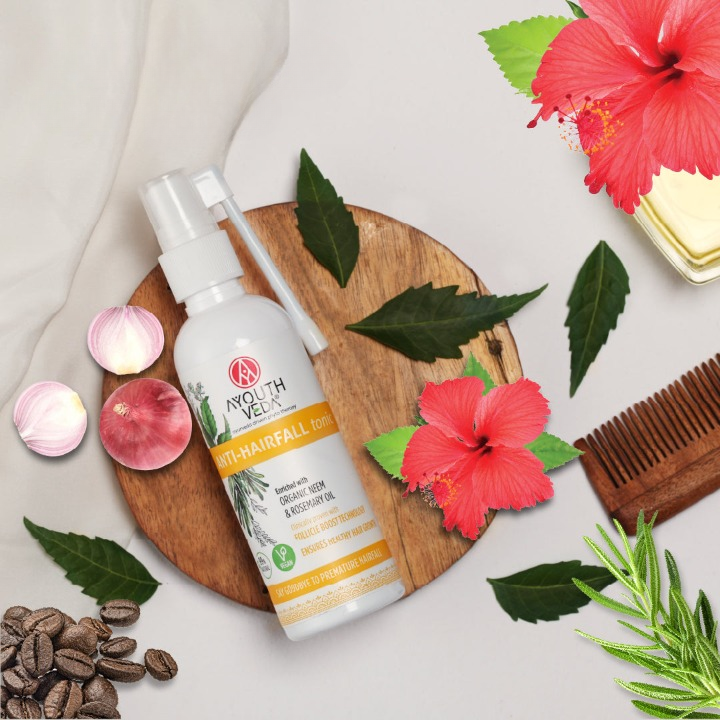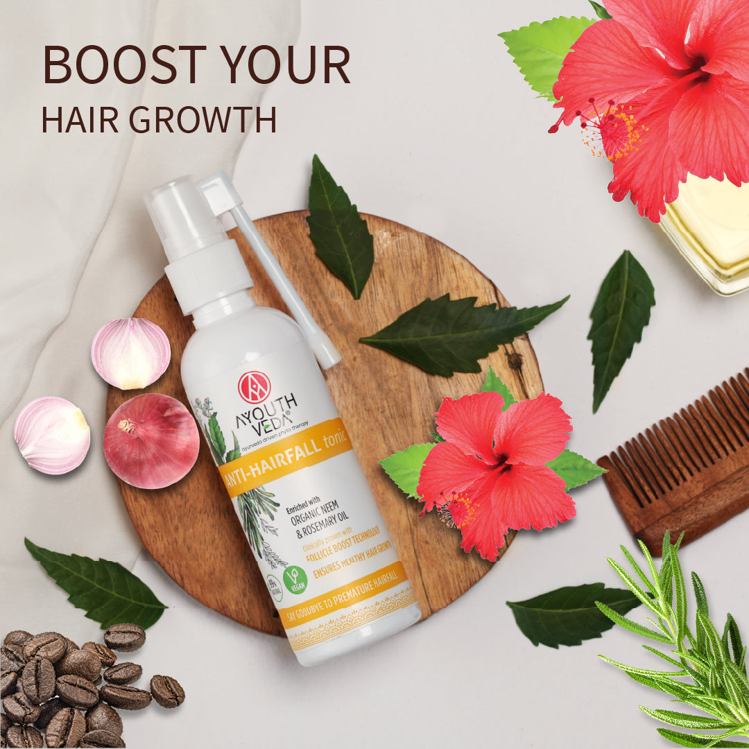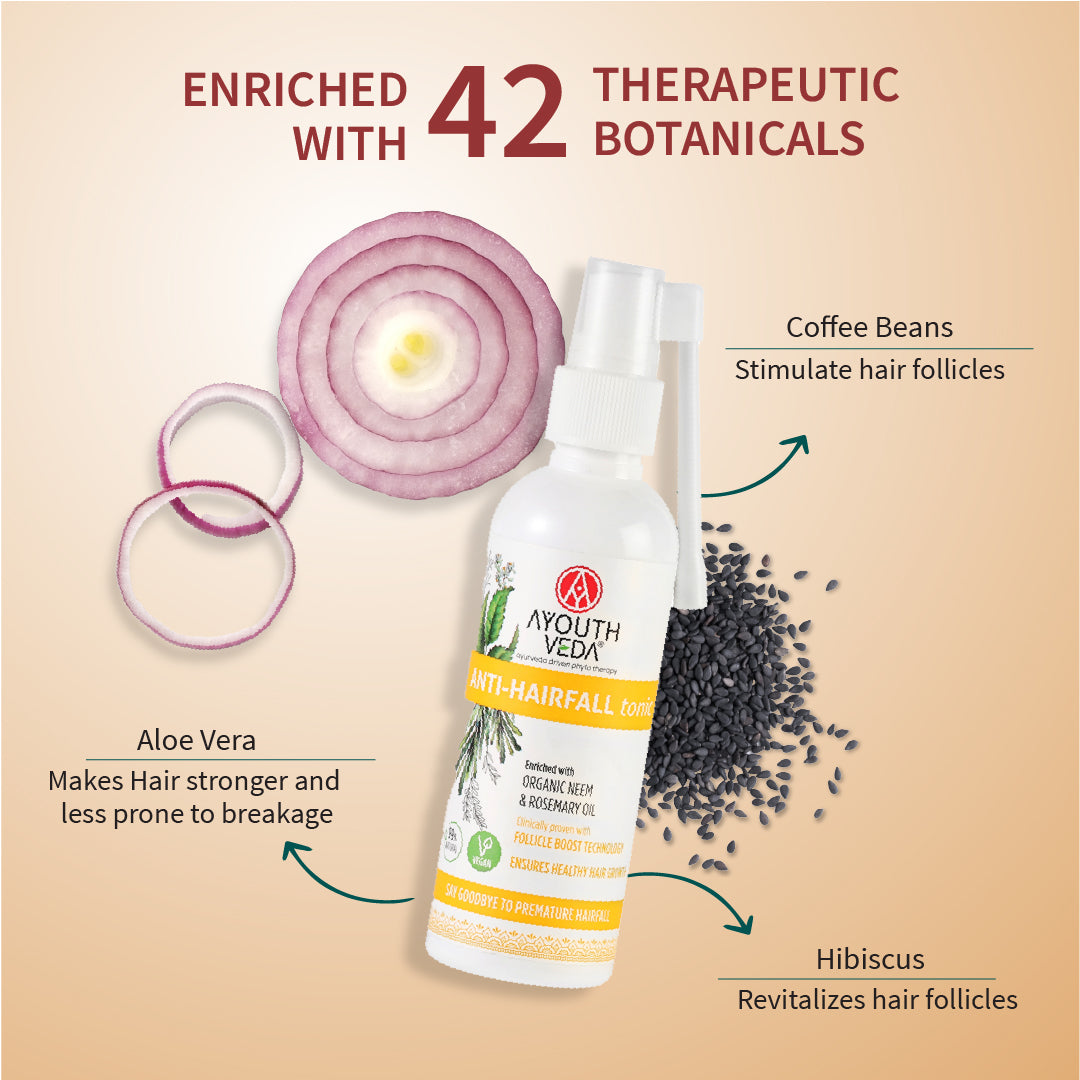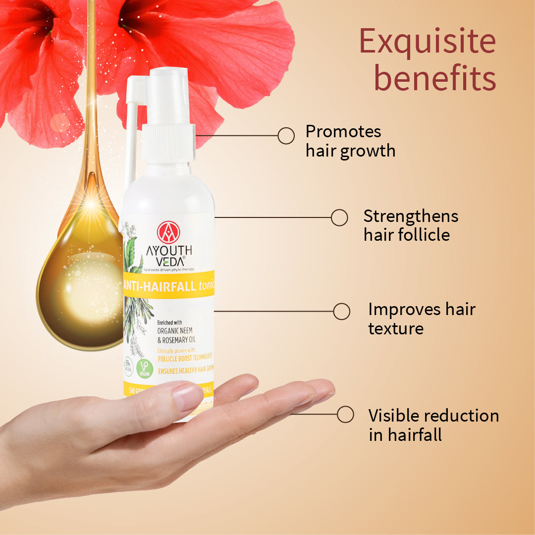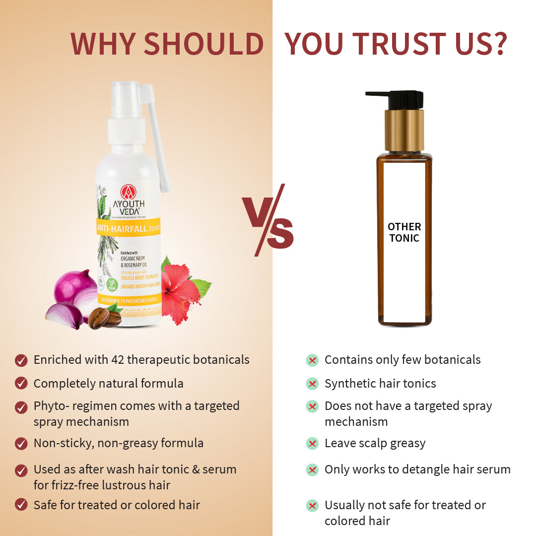 AYOUTHVEDA Anti-Hair Fall Tonic promotes shinier, smoother, and stronger hair, reducing tangles and breakage for healthier-looking locks.